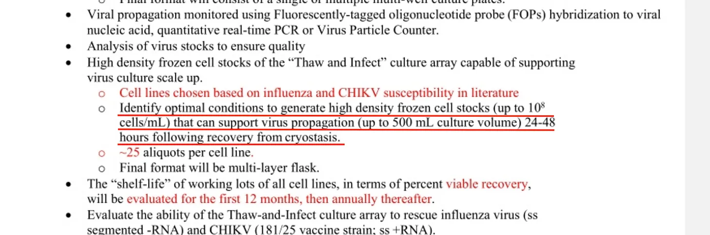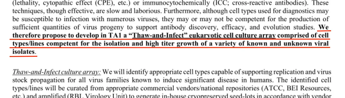 Die DARPA verlangte von Duke, eine gefrorene Bibliothek mit hochdichten menschlichen, tierischen und immortalisierten Zelllinien zu unterhalten, die in der Lage sind, fast jedes Virus sofort zu züchten – selbst solche mit unbekannter Identität: