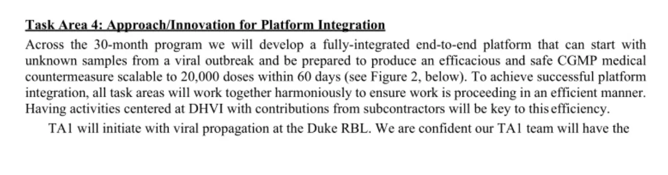 „Im Rahmen des 30-monatigen Programms werden wir eine vollständig integrierte End-to-End-Plattform entwickeln, die mit unbekannten Proben aus einem Virusausbruch beginnen und innerhalb von 60 Tagen eine wirksame und sichere CGMP-medizinische Gegenmaßnahme produzieren kann, die auf 20.000 Dosen skalierbar ist.“