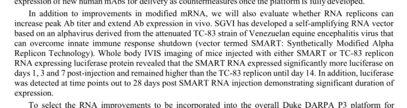 „Zusätzlich zu den Verbesserungen bei modifizierter mRNA werden wir auch untersuchen, ob RNA-Replikons den maximalen Antikörpertiter erhöhen und die Antikörperexpression in vivo verlängern können. SGVI hat einen selbstverstärkenden RNA-Vektor entwickelt, der auf einem Alphavirus basiert, das aus dem abgeschwächten TC-83-Stamm des venezolanischen Pferdeenzephalitis-Virus gewonnen wurde und die Abschaltung der angeborenen Immunantwort überwinden kann (Vektor mit der Bezeichnung SMART: Synthetically Modified Alpha Replicon Technology). Die Ganzkörper-IVIS-Bildgebung von Mäusen, denen entweder SMART- oder TC-83-Replikon-RNA injiziert wurde, die das Luciferase-Protein exprimiert, zeigte, dass die SMART-RNA an den Tagen 1, 3 und 7 nach der Injektion signifikant mehr Luciferase exprimierte und bis zum Tag 14 höher blieb als das TC-83-Replikon. Darüber hinaus wurde Luciferase bis zu 28 Tage nach der SMART-RNA-Injektion nachgewiesen, was eine signifikante Expressionsdauer belegt.“