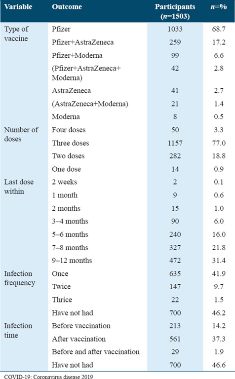 Die Studienstichprobe umfasste 1.662 Antworten aus verschiedenen Altersgruppen, Regionen und Nationalitäten. Die Studienstichprobe umfasste Teilnehmer, die mindestens eine Impfdosis in den COVID-19-Impfkliniken des saudi-arabischen Gesundheitsministeriums mit einer der drei pharmazeutischen Marken Pfizer, AstraZeneca und/oder Moderna erhalten hatten.
