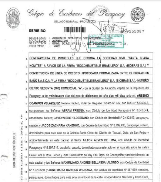 Según documentos a los cuales accedió el equipo de La Caja Negra, la estancia “Cielo Azul” está compuesta por las fincas 7.034 (de 3.640 hectáreas), 10.914 (1.064 hectáreas) y 11.046 (1.242 hectáreas). En diciembre del 2010, la sociedad civil Santa Clara Komitee las vendió y transfirió a la firma Biocombustible Brasilero Biobras, por el precio de 2.500.000 dólares americanos. En ese entonces el presidente de Biobras era Ailton Alves de Lima.