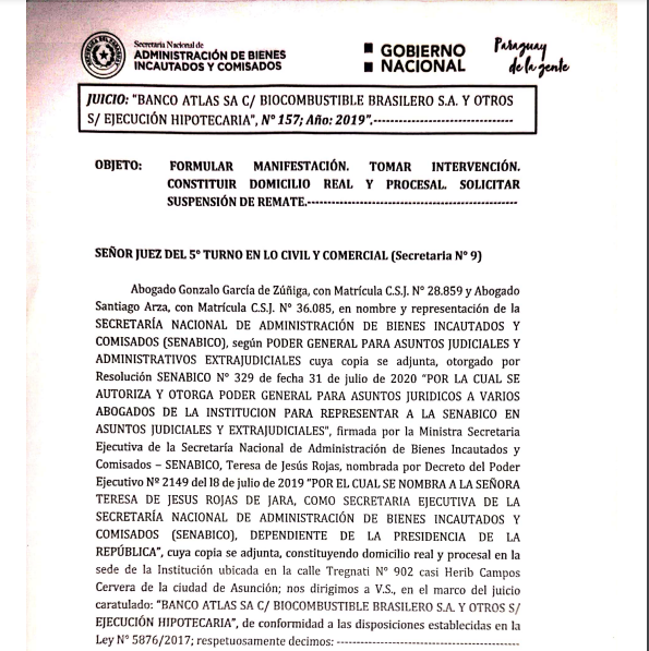 El 9 de febrero de este año, el director de Asuntos Legales de Senabico, Santiago Arza, presentó un pedido de suspensión del remate judicial ante el juez Alfredo Barrios. En su solicitud aclaró que no se buscaba perjudicar al acreedor (banco Atlas), ya que el artículo 89 del Código Penal Paraguayo establece la indemnización de terceros cuando ocurra el comiso de los bienes. Argumentó que el remate será lesivo no solo a los intereses de Senabico sino que también del Estado paraguayo. Y recordó que el comprador que adquiera los inmuebles no podrá inscribirlos a su nombre, al existir la prohibición de contratar que pesa sobre los mismos.