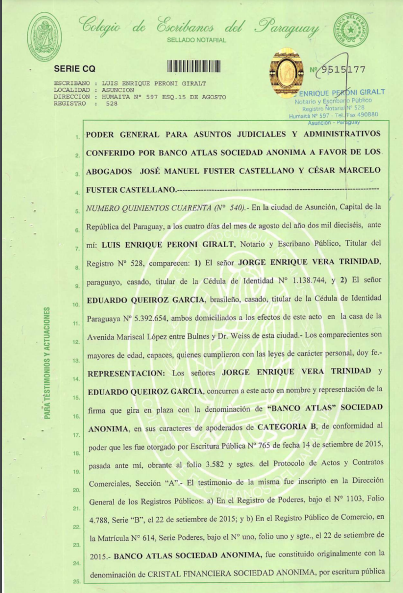 Según consta en documentación, los abogados Eduardo Queiroz García y Jorge Enrique Vera Trinidad, en representación de Atlas, y Gilberto Suárez y la esposa de este, Rosa Amarilha Gomes (en calidad de codeudora), acordaron una línea de crédito de hasta la suma de US$ 6.421.857,37, la cual iba a ser utilizada mediante préstamos y otras operaciones bancarias. Se tuvo acceso además al pagaré firmado por el presunto prestanombres, Gilberto Suárez, por el valor mencionado.