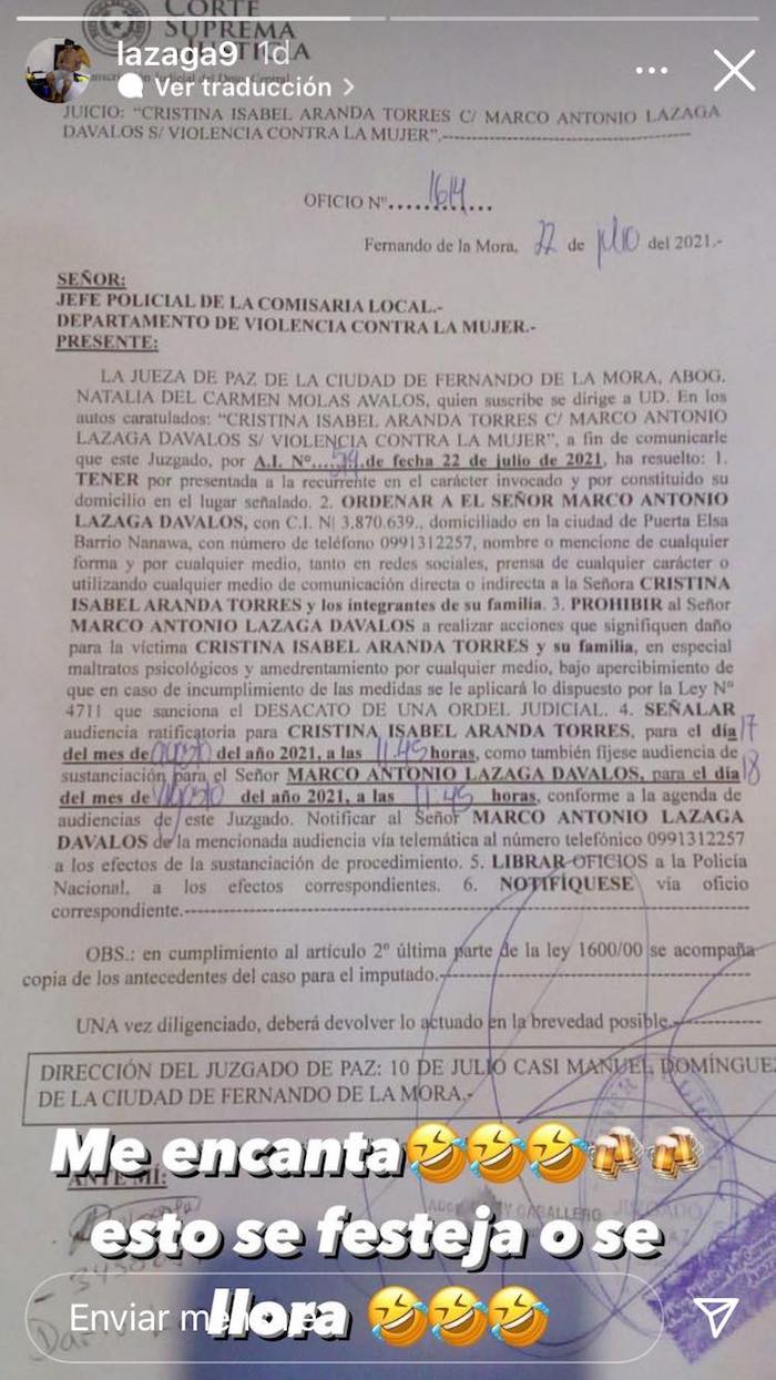 Desde el segmento historias de su perfil en Instagram, Lazaga compartió la orden judicial que establece la prohibición al mismo de hablar de Vita y su familia a través de cualquier plataforma ni medios de prensa.