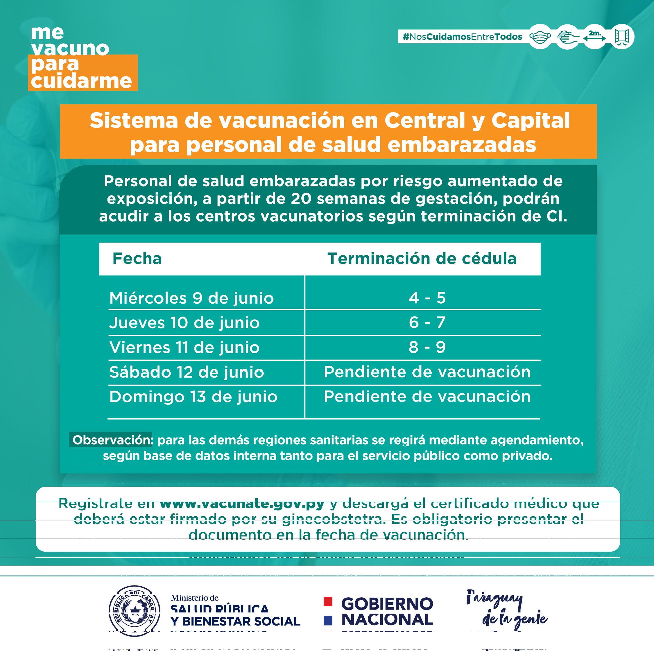 En cuanto a la población que no sea de Central y Asunción, las embarazadas mayores de 18 años, también a partir de las 20 semanas de gestación y con algún factor de riesgo, deberán agendarse y esperar que el Ministerio de Salud informe la fecha, la hora y el lugar de la vacunación.