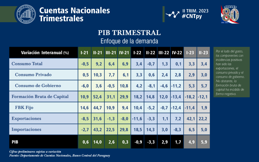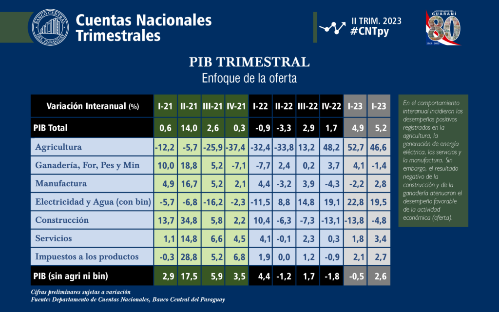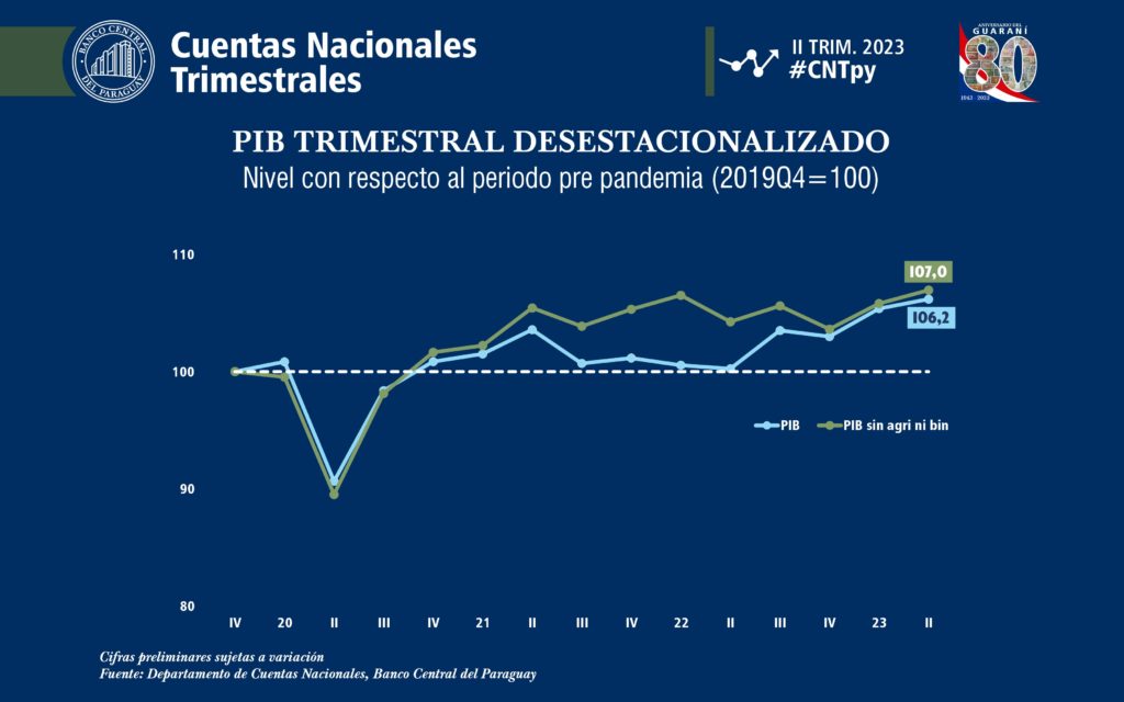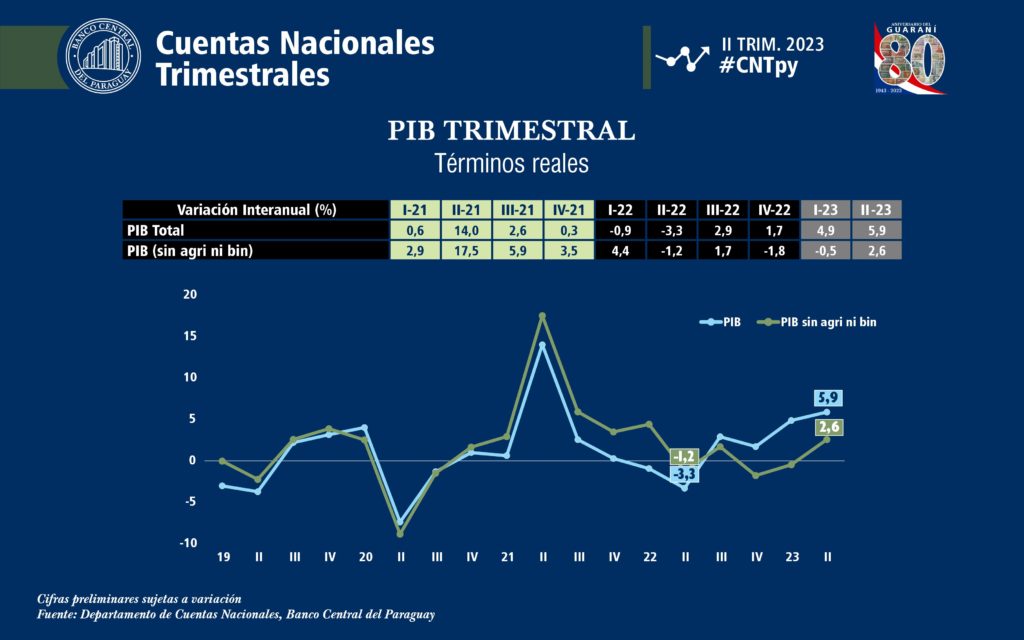 Asunción (Paraguay), 26 sept. (PLUS).- El Producto Interno Bruto (PIB) de Paraguay presentó un crecimiento interanual de 5,9% en el segundo trimestre del 2023, acumulando un crecimiento de 5,4% al cierre del primer semestre de 2023, según datos publicados por el Banco Central del Paraguay (BCP).