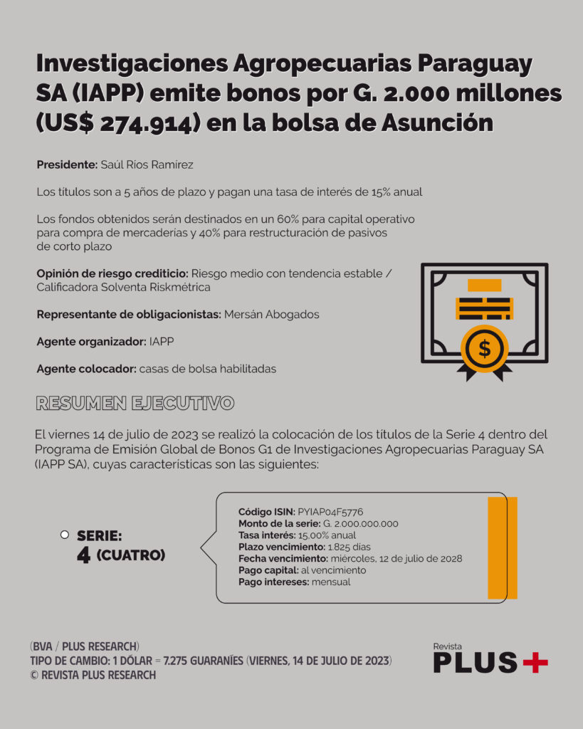 El viernes 14 de julio de 2023 se realizó la colocación de los títulos de la Serie 4 dentro del Programa de Emisión Global de Bonos G1 de Investigaciones Agropecuarias Paraguay SA (IAPP SA), cuyas características son las siguientes: