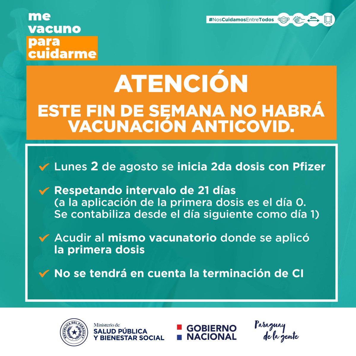 Al arribo de las vacunas, se comunicará como seguirá el esquema de vacunación correspondiente a esta plataforma. De esta manera, se reitera que, este fin de semana, no se aplicará la vacuna AstraZeneca.