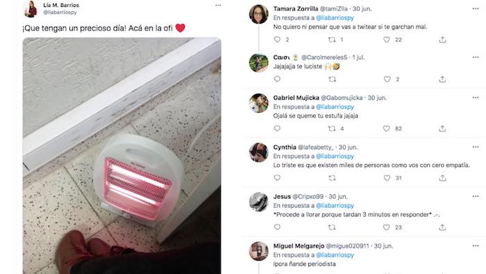 Posteriormente, Barrios publicó la foto de sus pies junto a una estufa en “la ofi”, y los internautas no perdieron oportunidad para volver a disparar contra ella recordándole su falta de empatía y tratándola de “desagradable” e “infumable”.
