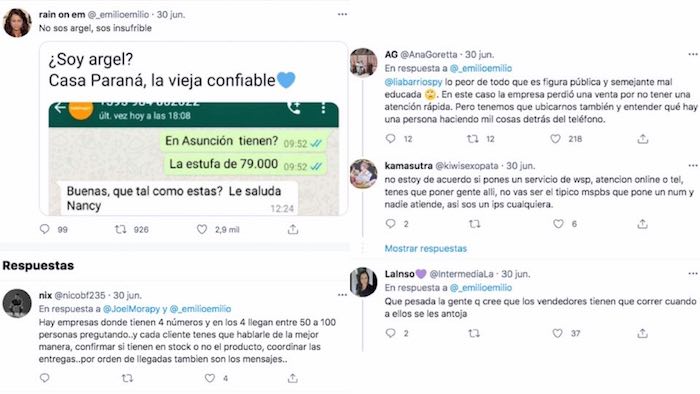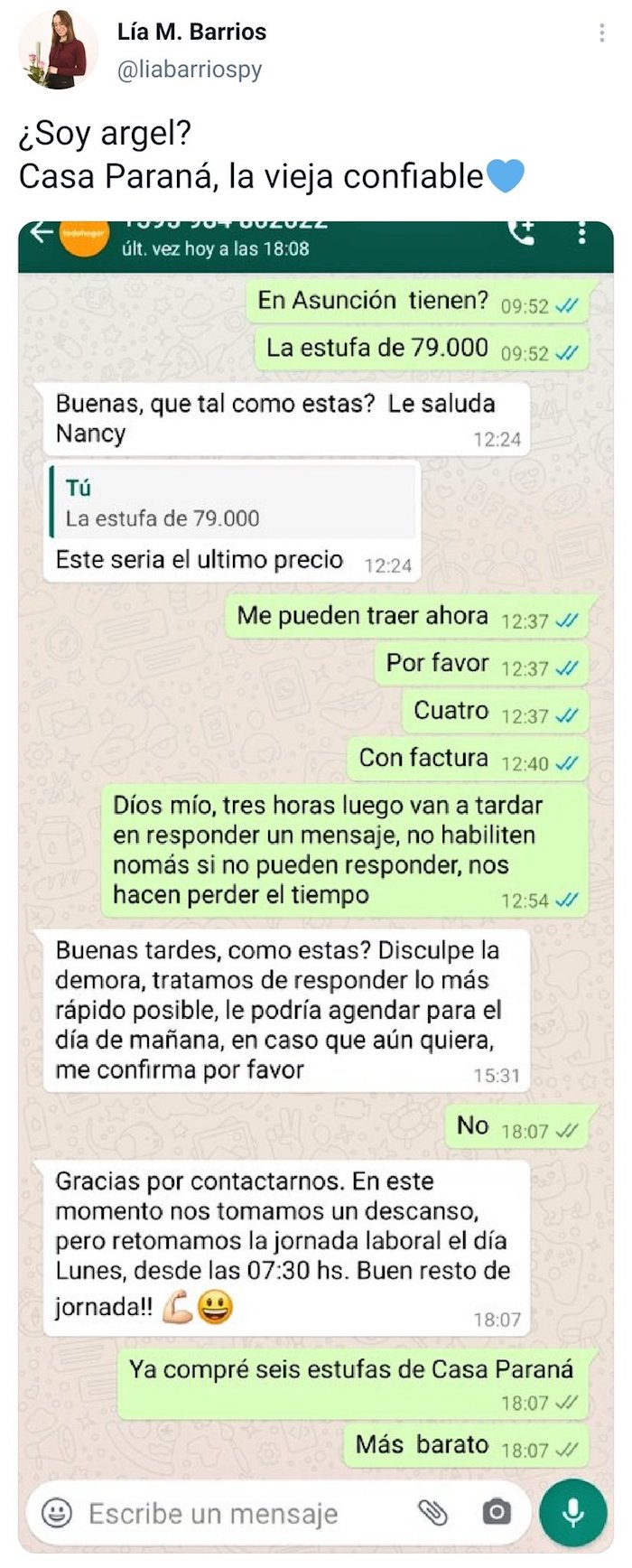 La misma compartió la captura de pantalla de la conversación que mantuvo con un o una representante de la firma. “¿Soy Argel? Casa Paraná, la vieja confiable”, escribió la comunicadora en su tweet.