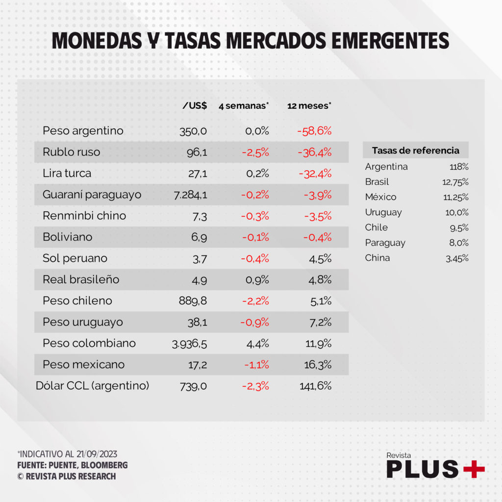Las monedas emergentes tuvieron un buen desempeño en el primer semestre de 2023, especialmente las de América Latina. No obstante, en el último mes (ver cuadro indicativo al 21/09/2023) se observa una reversión en dicha tendencia, al evidenciarse una depreciación en la mayoría de ellas, como el peso chileno, mexicano, uruguayo, el sol peruano y el guaraní, siendo el real brasileño la excepción en esta dinámica reciente.