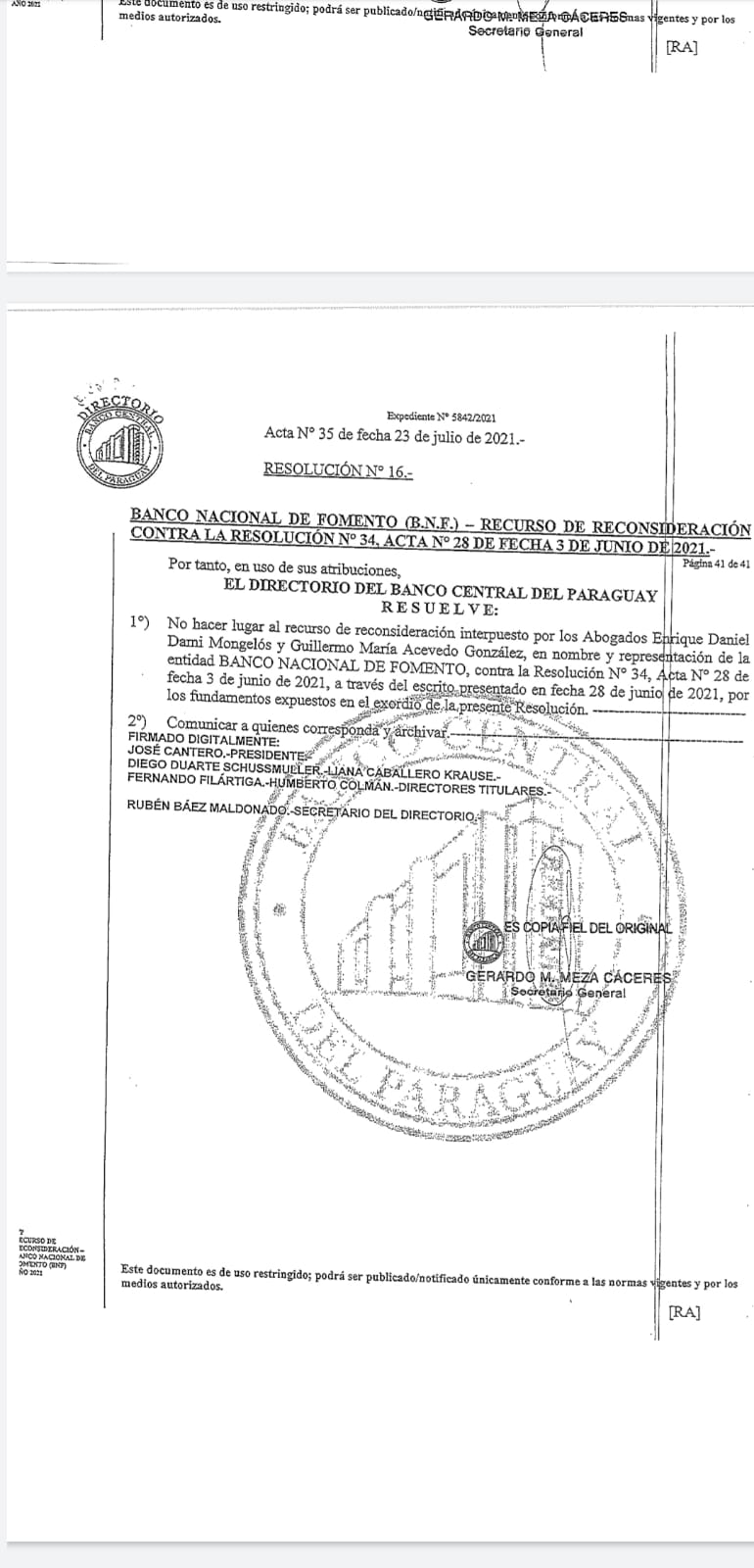 El 28 de junio del 2021 los representantes del BNF interpusieron un recurso de reconsideración contra la resolución 34 del BCP pidiendo que sea revocada por arbitraria y contradictoria. Aseguran que el BCP transgrede el artículo 14 de la Constitución Nacional sobre la irretroactividad de la ley y también el principio de legalidad al decidir aplicar la ley 6497/19 en vez de aplicar la Ley 489 (orgánica del BCP) para calificar las supuestas faltas como graves y hacer el análisis de la prescripción de la acción.