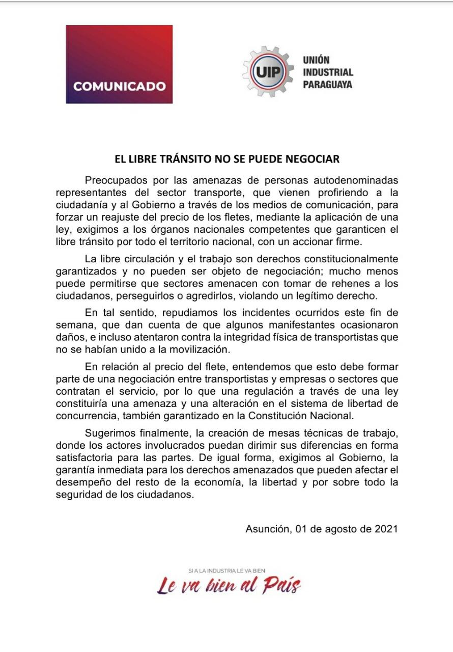 Respecto al tema del precio del flete, la Unión Industrial Paraguay sostiene que esto debe formar parte de una negociación entre transportistas y empresas o sectores que contratan el servicio, por lo que una regulación a través de la ley -tal y como plantean los camioneros- “constituiría una amenaza y una alteración en el sistema de libertad de concurrencia”.