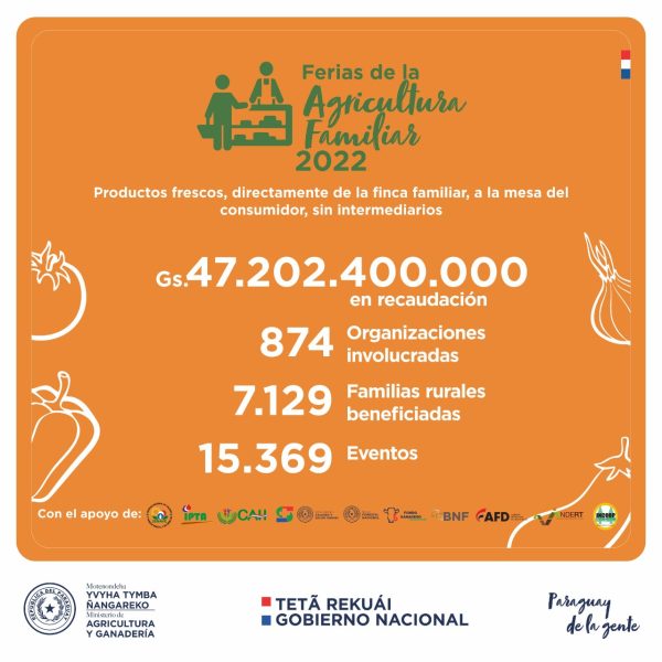 La cartera Agropecuaria dio a conocer en la fecha que, el total recaudado mediante las 15.369 ferias agropecuarias desarrolladas a la fecha ascienden a G. 47.202.400.000 (más de USD 6.7 millones). La cifra alcanzada beneficia directamente a 7.129 pequeñas familias rurales que están organizadas en 874 Organizaciones o Comités.