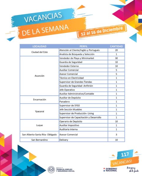 Asunción, Agencia IP.- La Vidriera de Empleo del Ministerio de Trabajo cuenta con 117 vacancias laborales para esta semana, puestos que están siendo requeridos por el sector privado. Los rubros más solicitados son para delivery, guardia de seguridad, atención al cliente y vendedor de playa.